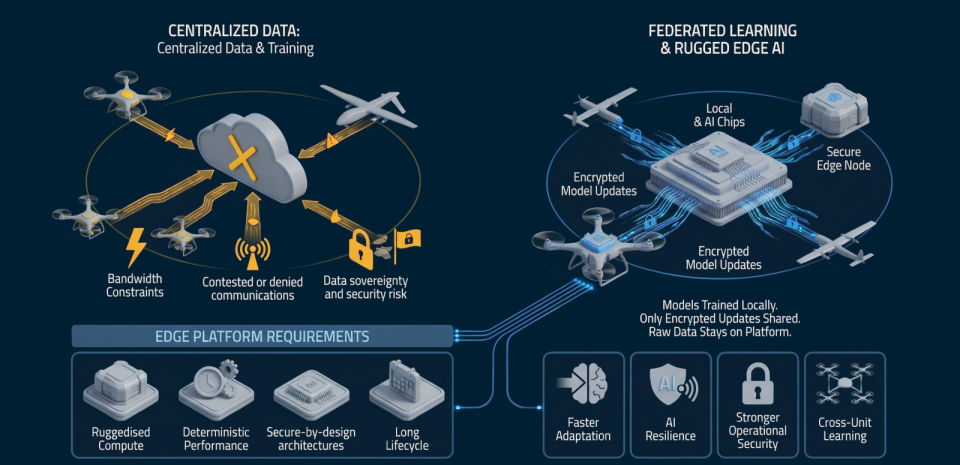 This is where Federated Learning + Rugged Edge AI changes the equation. Instead of streaming sensitive imagery and telemetry to the cloud, models are trained locally on drones or hardened edge nodes. Only encrypted model updates are shared. Raw data never leaves the platform.